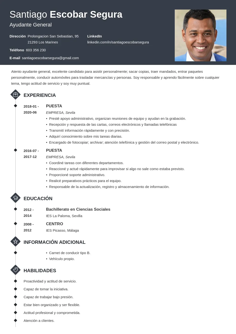 - Orden cronológico inverso: Independientemente de si están finalizados o en curso, ordena tus estudios en orden cronológico inverso, desde el más reciente al más antiguo.