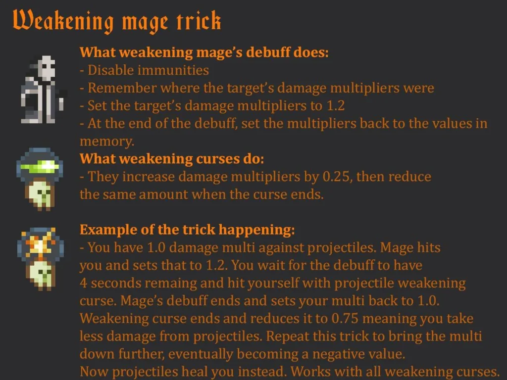 La Maldición del Debilitamiento puede explotarse para superar las inmunidades de los enemigos. En algunos juegos, aplicar la maldición a un enemigo inmune a un tipo específico de daño puede reducir su resistencia a ese daño a un mínimo, haciendo que reciba una pequeña cantidad de daño incluso si normalmente sería inmune.
