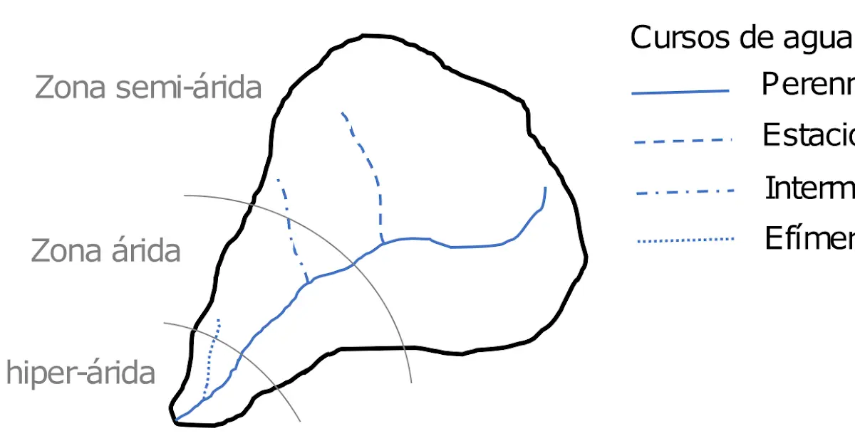 - Cursos de agua intermitentes: Presentan flujo durante parte de la época húmeda, pero solo algunos años.