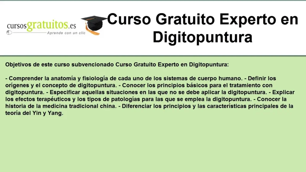 - ¿Existen cursos de digitopuntura completamente gratis? Si bien es difícil encontrar cursos completos y estructurados totalmente gratuitos, existen recursos online gratuitos que proporcionan una introducción a la técnica.