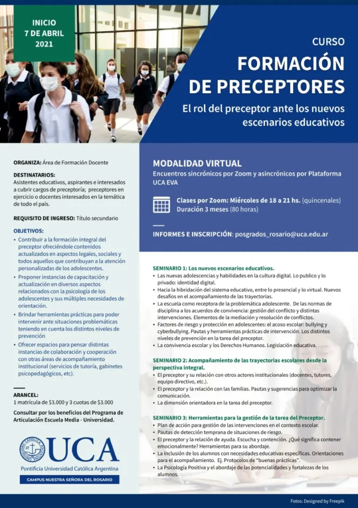 La formación para preceptores incluye aspectos relacionados con la gestión administrativa, la orientación vocacional, la convivencia escolar, la resolución de conflictos, la atención a las familias y otras cuestiones relevantes para el desempeño de la función.