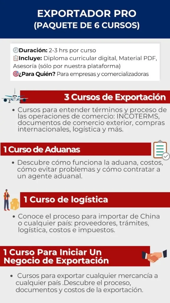 | ¿Qué tipo de documentación necesito para exportar? | Depende del producto, el país de destino y las regulaciones internacionales. Un curso de exportación te ayudará a entender todos los requisitos. |