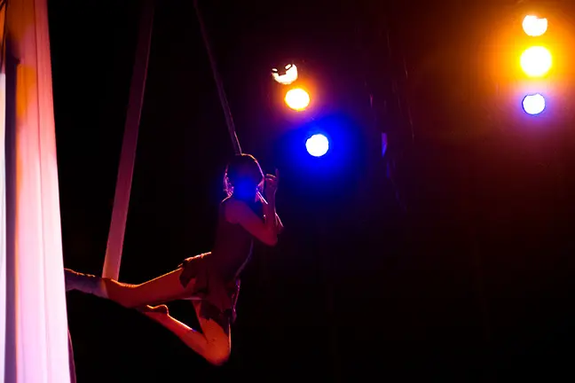 • Telas Aéreas: Utilizando telas largas y resistentes, los acróbatas realizan impresionantes movimientos de fluidez y elegancia.
